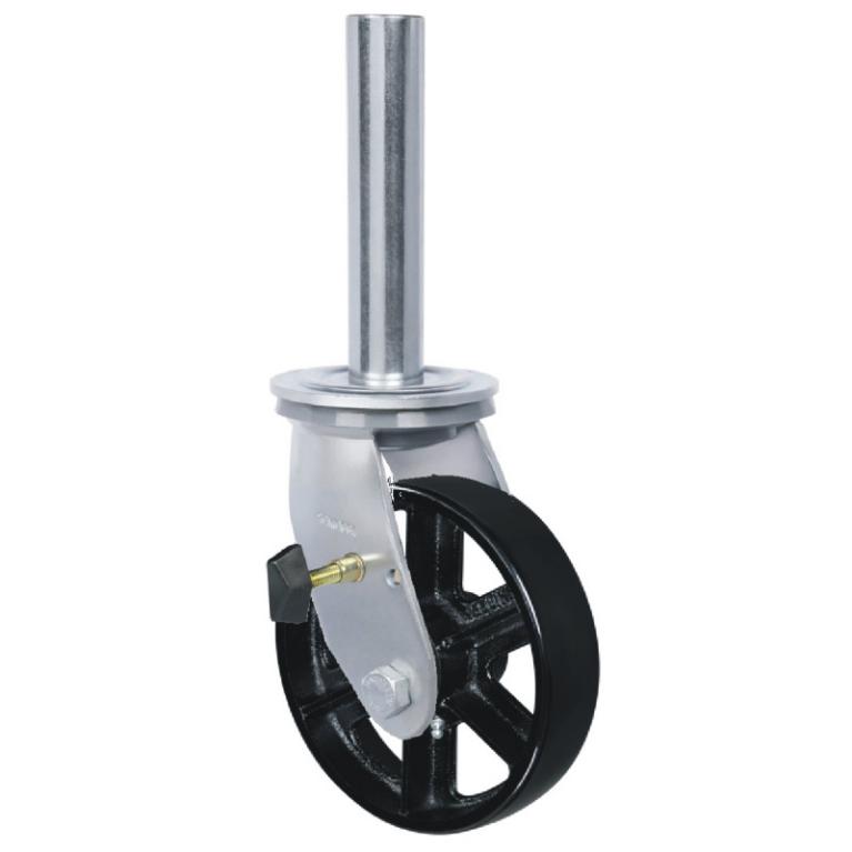 Garfo – Garfo reforçado, fabricado em chapa estampada e cabeçote com dupla pista de esferas, acabamento zincado. Eixo da roda parafusado.