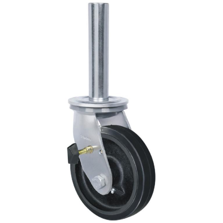 Garfo – Garfo reforçado, fabricado em chapa estampada e cabeçote com dupla pista de esferas, acabamento zincado. Eixo da roda parafusado.
